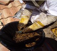 African honeybee colonies are always dangerous to handle, sometimes lethal, and can cause tremendous damage to homes and commercial building structures if not treated properly. Improper methods worsen the damage and lead to future bee problems. Bee pheromone, a marker scent the bee colony deposits at the site, does not go away on its own and cannot simply be scrubbed away with soap and water. A passing swarm can pick up the marker from a considerable distance away and will try to re-occupy a former bee site before it will go anywhere else. Honeycomb, if not removed properly, will immediately start attracting robbing bees from other local colonies and begin liquefying and melting down. Honeycomb meltdown can saturate building materials like drywall and insulation, cause wet rot to framing structures, attract other unwanted pests and spread pheromone scent throughout your walls making the problem much larger.